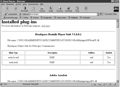 Der Netscape Navigator hat einen Menübefehl Help • About plug-ins bzw. Hilfe • Über Plug-ins, der Ähnliches leistet. In Abbildung 14.1 finden Sie eine Beispielsausgabe.